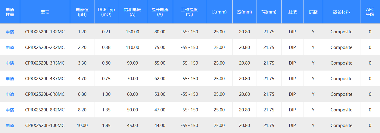 CPRX系列电感值范围为1.2μH ~ 22.0μH,DCR仅为0.25mΩ,饱和电流最高可达150A,可在高温环境下长期工作并保持稳定的电感值和直流偏置能力。目前,CPRX2520L系列已通过AEC-Q200测试认证,具有很高的可靠性,产品工作温度范围为-55℃~+150℃(包含线圈发热),适应各类严苛的应用环境。